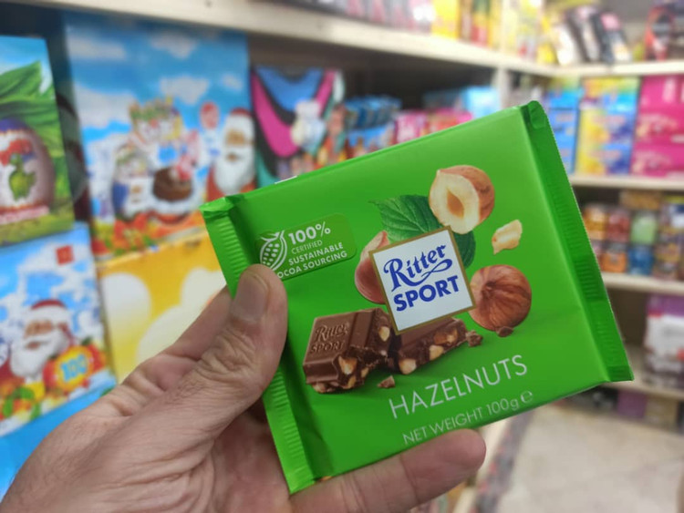 شکلات ریتر اسپرت فندقی، خرید شکلات ریتر اسپرت، شکلات آلمانی، Ritter Sport فندقی 100 گرم، قیمت شکلات ریتر